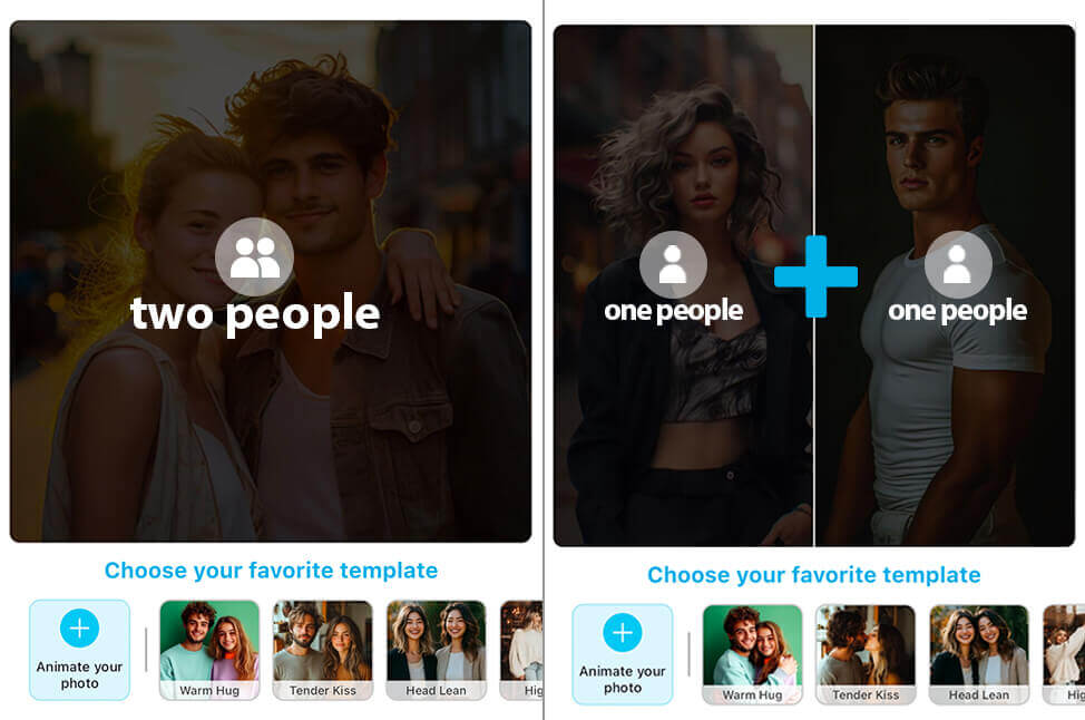 Вы можете загрузить общее парное фото или два отдельных портрета. Искусственный интеллект затем объединит снимки в одно видео — получится ещё более волшебный и романтичный результат!