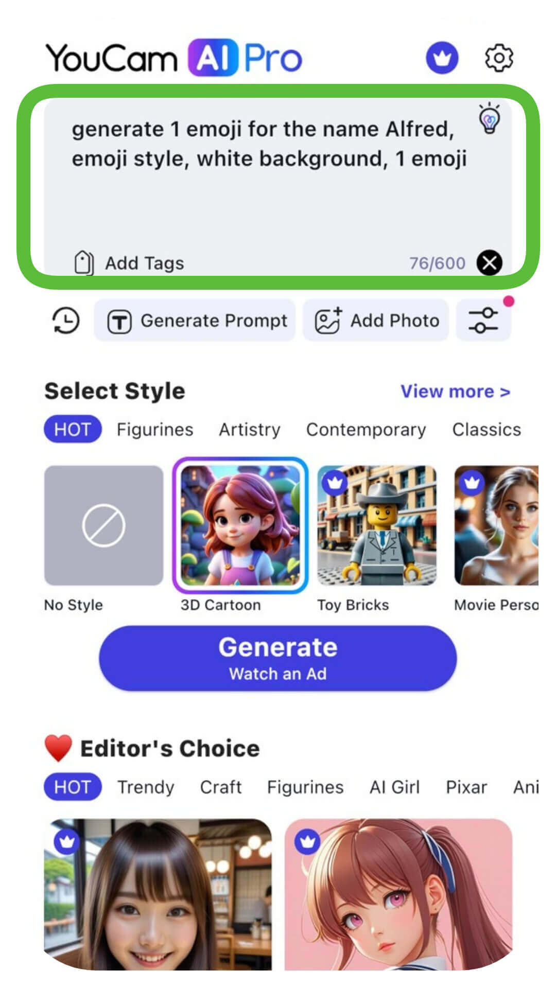 - YouCam AI Proyu açın ve isminizi ve emojiniz için istediğiniz belirli detayları içeren bir komut (prompt) girin.
