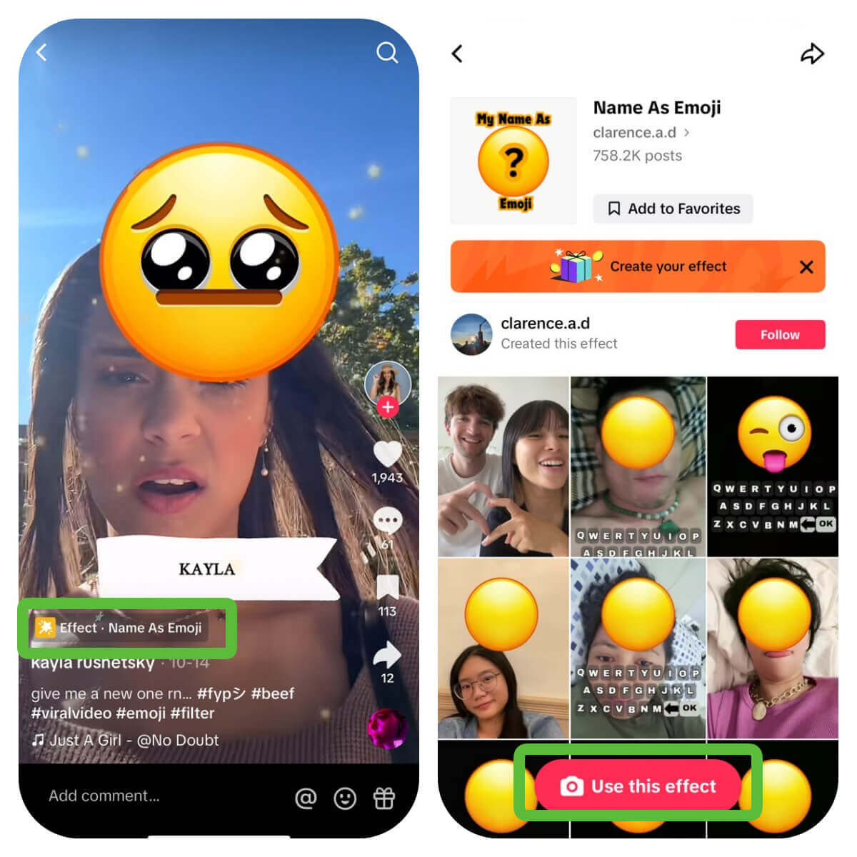 - Filtreyi açtığınızda, kullanıcı adının üzerinde turuncu bir yıldızla "Name as Emoji" yazısını göreceksiniz. Denemek için üzerine dokunun.