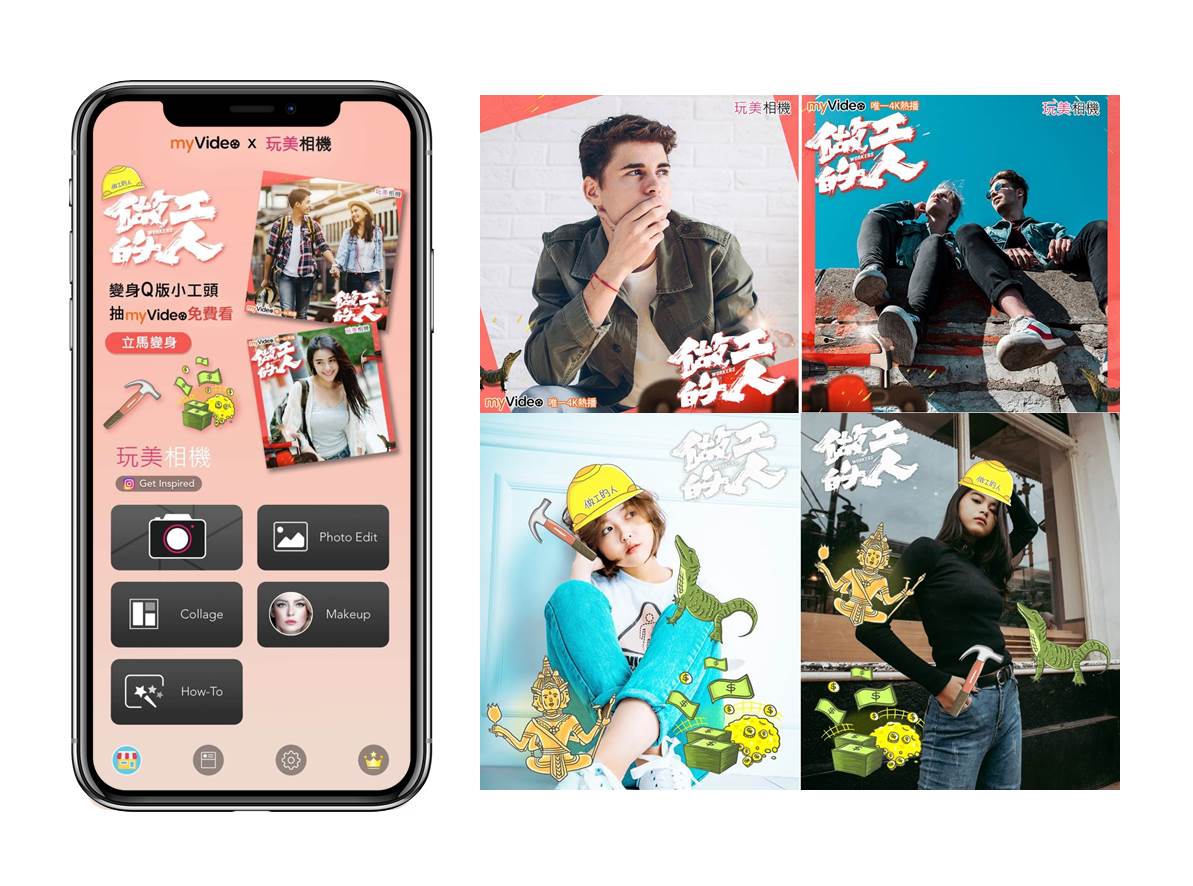 【2020年5月6日,台北訊】訊連科技(5203)轉投資公司、全球美妝科技領導者—「玩美移動」旗下「玩美相機(YouCam Perfect)」App,攜手台灣大哥大(3045)myVideo 5月10日起線上唯一4K首播—與金鐘影集《我們與惡的距離》製作團隊大慕影藝合作的年度大戲《做工的人》聯名活動搶先開跑!獨家2款主題框及6款可愛手繪貼圖,讓你一秒變身Q版小工頭!活動期間,參加活動就有機會獲得myVideo豪華月租7天免費追劇電子序號!