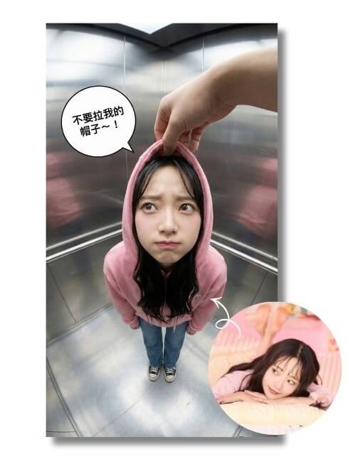 身穿黑色素面連帽上衣。 連帽從上方被「另一個人」的手捏住並提起,上傳照片中本人雙手自然垂放於身體兩側。 畫面為正上方俯視角度,臉部比例稍微放大。 從頭到腳全身完整入鏡。背景設定為電梯內部,具有金屬質感的內裝。 自然的室內光線,寫實照片質感,高解析度。 避免過度動畫風、插畫風或 3D 風格。 對話框內可愛中文文字為:不要拉我的帽子~!