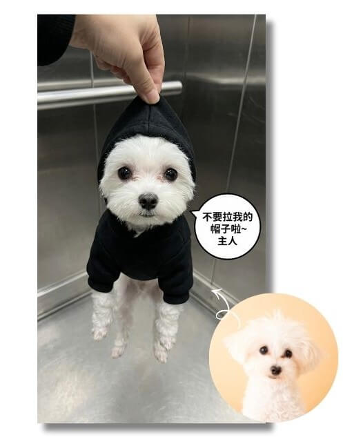 以上傳的寵物臉部照片為基礎,生成一張偏寫實、可愛的寵物全身照。骨架、五官比例、臉型輪廓與整體氣質,需忠實保留原本人物的特徵,身穿黑色素面連帽上衣。連帽從上方被「另一個人」的手捏住並提起,上傳照片中本人四肢自然垂放於身體兩側。 畫面為正上方俯視角度,臉部比例稍微放大。從頭到腳全身完整入鏡。