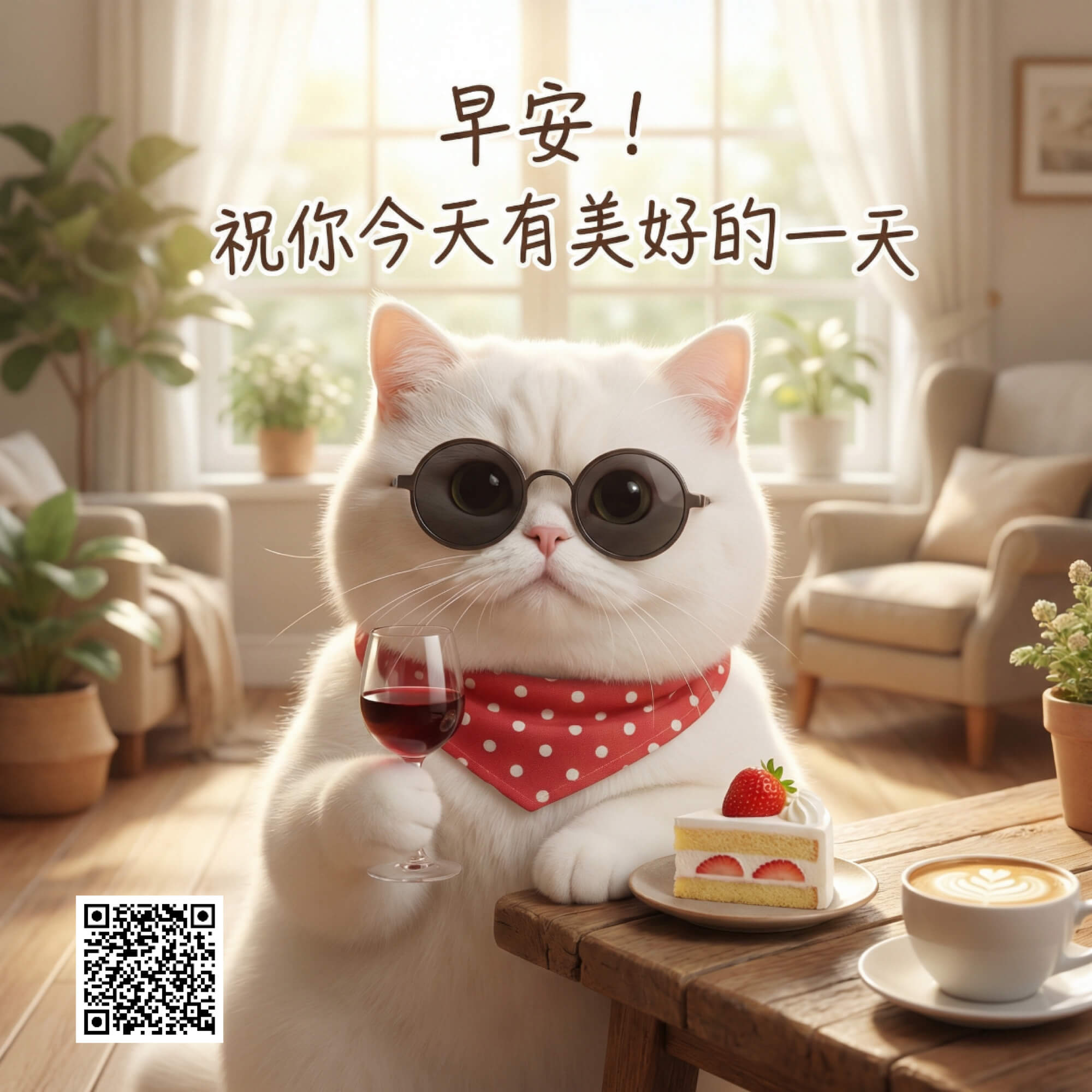 - AI 繪圖指令:圓臉白色可愛貓咪坐在木質桌旁,深黑色墨鏡正確戴在貓咪臉上並覆蓋雙眼,鏡框貼合臉型,墨鏡位置在眼睛前方,不是頭頂、不是額頭,紅色白點頭巾綁在脖子,貓咪舉起一杯紅酒,桌上放草莓蛋糕與拿鐵咖啡,背景是溫暖室內客廳,大片窗戶灑進自然陽光,貓咪比例偏Q版,大而圓的眼睛輪廓(被墨鏡遮住),毛髮柔軟細緻,風格:寫實+Q萌混合,療癒居家感,柔光攝影,淺景深,高解析度,IG風格,可愛但偏真實,圖片上方有可愛字體:「早安!祝你今天有美好的一天」。