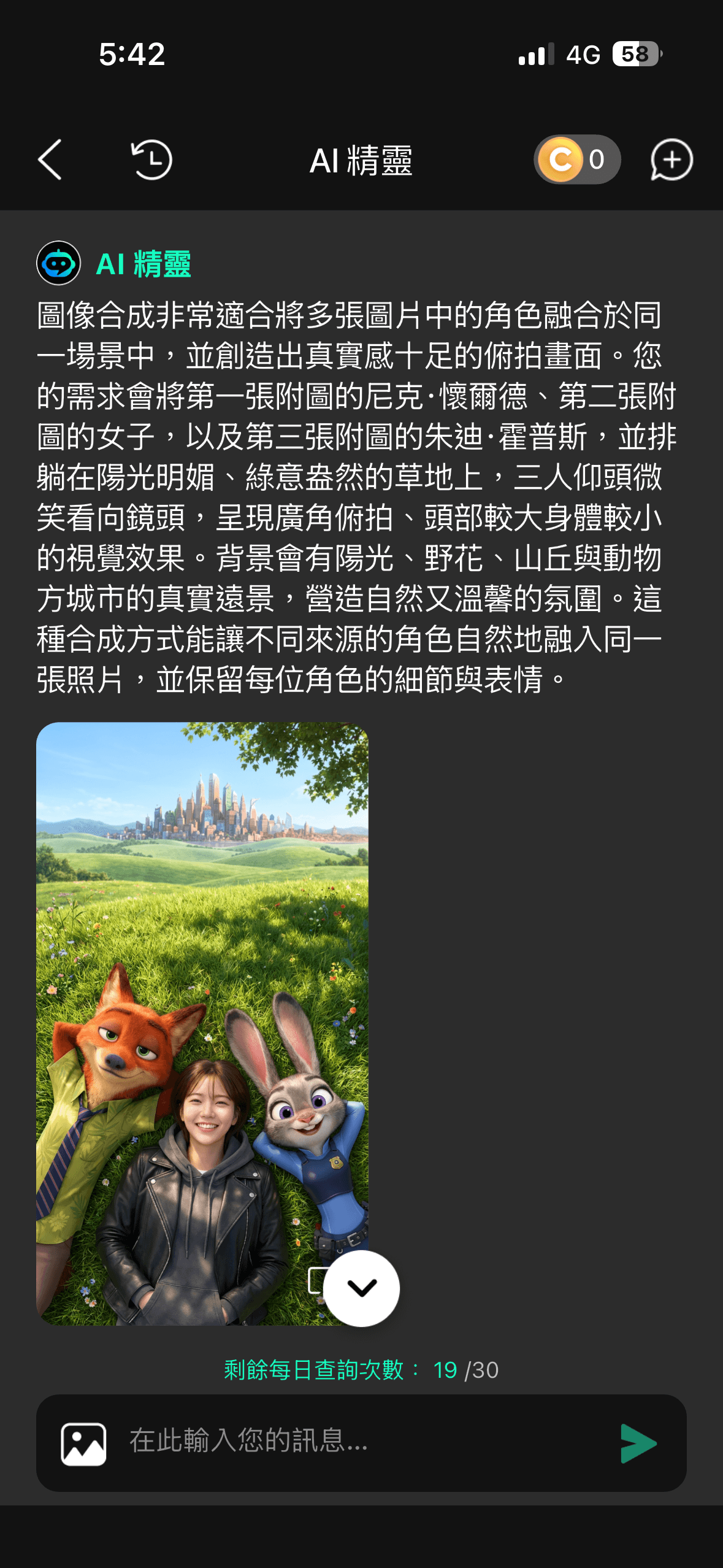 在使用這款 App 時,如果你指輸入【Zootopia, random animal character】會高機率變成兔子或狐狸的角色,如果你想變成其他角色可以直接使用 AI 指令來生成: