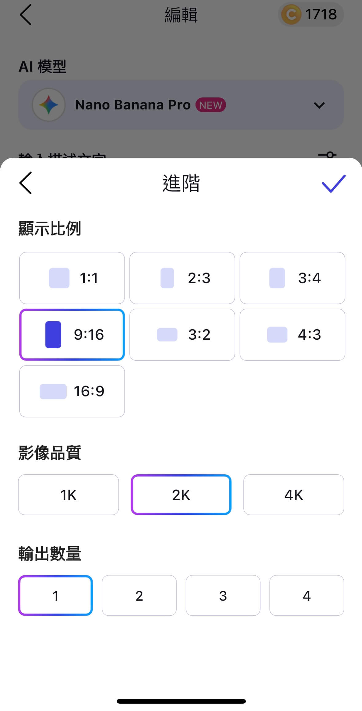 ▲ 建議選擇最新生成模型 : Nano Banana Pro,除了支援更好的中文認知能力外,也有更多的尺寸能夠進行選擇!