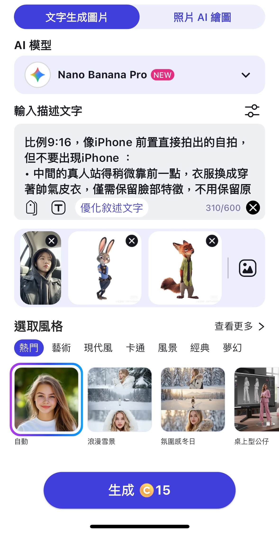 以下的合成照將使用 App【玩美 AI 繪圖】,這款 App 不只支援最新圖片生成模型:Nano Banana Pro, 更已全面融入世界主流 AI 照片生成模型(含多模型模式),讓你能在同一個 App 中一次體驗多種最強生成模型,除了超過 50 種畫風與自訂風格可以使用、全介面與指令皆完整支援中文、每天還提供免費生成機會。更重要的是擁有這款App,你將能夠享受真正的一站式 AI 生圖流程。