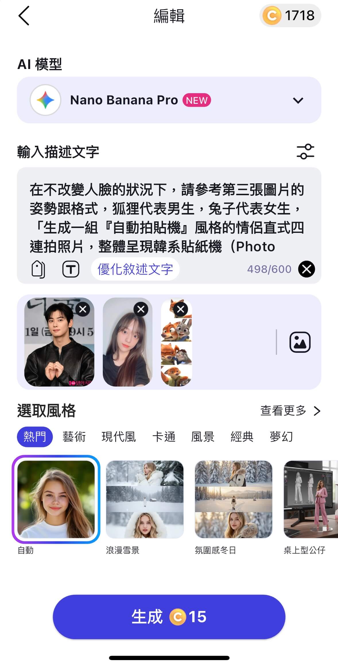 不管是情侶照、閨密照、朋友照,或是「和電影/動畫角色合照」都能快速生成,視覺效果可愛、逗趣、具有創意感。