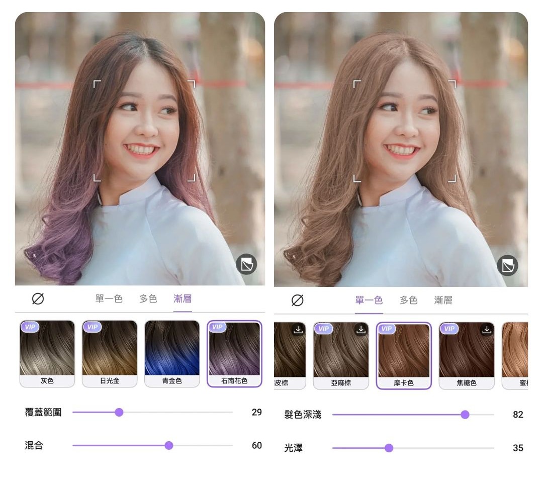 - 自動偵測頭髮,一鍵套用多種髮色