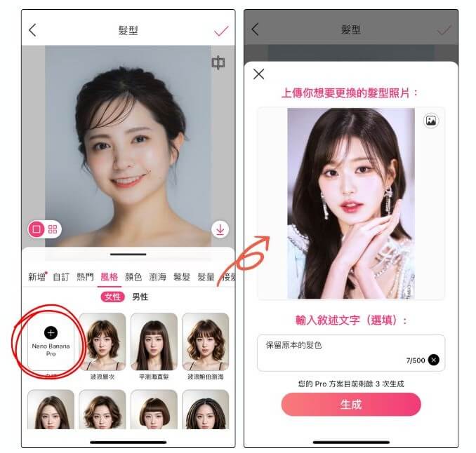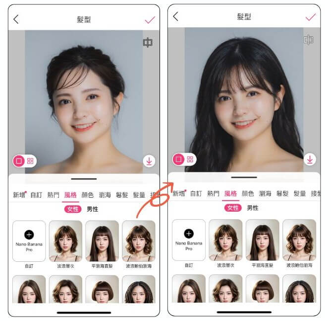 ▲ 套用超過 40 種的女生髮型並立即體驗最新功能:Nano Banana Pro 換髮型