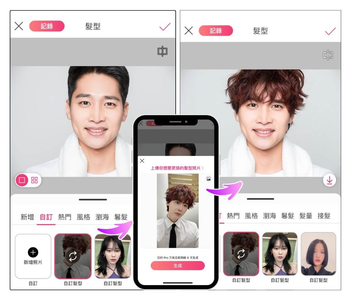 此外,玩美彩妝獨特的「自訂髮型」模擬,可即時套用並預覽各種男生髮型,無論長短或風格都能自由測試,生成畫面無浮水印、畫質清晰。
