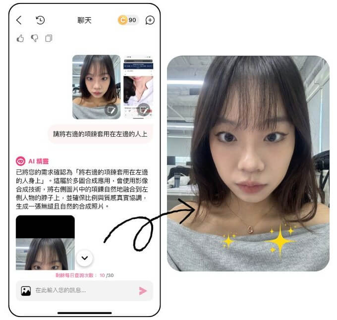 AI 精靈能分析她的臉型、五官比例及穿搭個性,並推薦最個適合她魅力的款式,它甚至能讓你看到「她戴起來會長什麼樣子」的虛擬試戴效果。