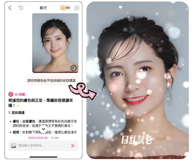 與市面上對話機器人不同的是, 精準的「個人色彩分析」功能能根據你的膚色底調、髮色與五官對比,自動判定你的色彩鑑定及五官分析,並推薦適合的彩妝與髮色組合,讓整體造型更協調自然。