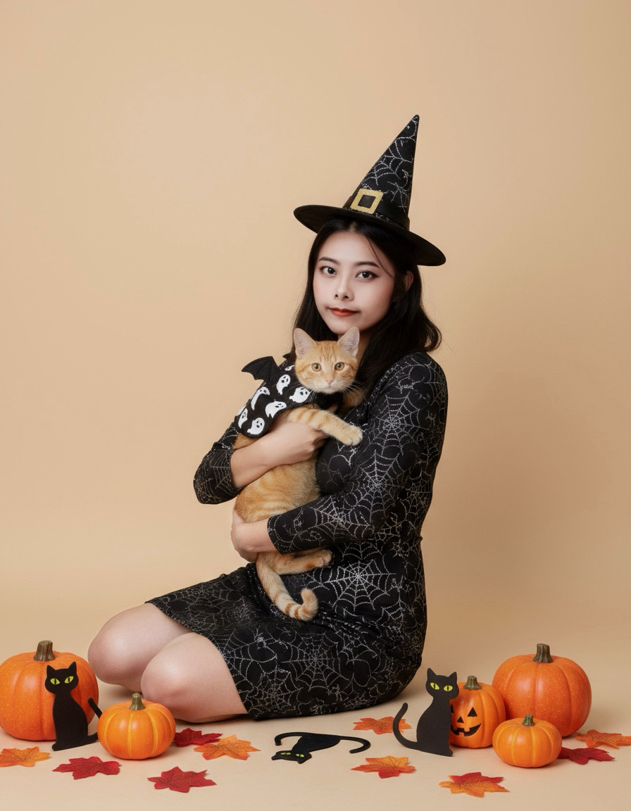 一張高品質的專業寵物沙龍照片,主角是照片中的橘貓。牠以全身姿態呈現,平視鏡頭,表情活潑、可愛且生動,透露出溫順與開心的情緒。這隻橘貓裝扮成萬聖節主題的可愛造型,例如:戴著迷你巫師帽,或者披著一件印有南瓜或鬼魂圖案的小披風,也可以是俏皮的蝙蝠翅膀裝飾。 背景是簡潔、無縫的單色(淺灰色或米色為佳),營造出專業攝影棚的氛圍,同時點綴豐富的萬聖節元素,例如裝飾性南瓜或落葉。光線採用柔和且均勻的工作室專業燈光,完美地勾勒出貓咪和其裝扮的輪廓,強調其毛髮和服飾的層次感和光澤,確保畫面沒有任何生硬的陰影。構圖清晰地呈現貓咪的全身,從平視角度拍攝。景深稍微深一些,讓背景保持一定的清晰度,同時仍將焦點集中在貓咪和其萬聖節裝扮上。照片質感應如同精修過般,擁有絕佳的清晰度、自然的色彩飽和度與適中的對比度,整體視覺效果專業、可愛且充滿萬聖節的節慶氛圍。