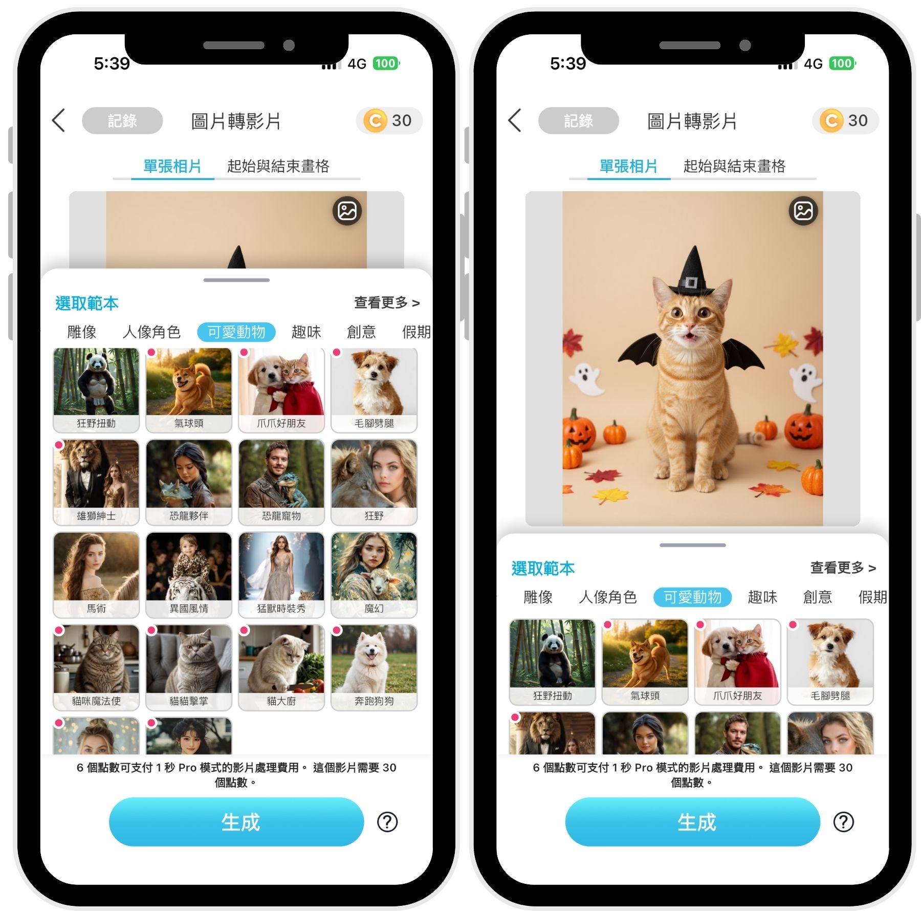 匯入剛剛做好的寵物攝影照片之後,就可以選擇一個你喜歡的動作模版,玩美 Video 很貼心的為小動物設了一個分類,讓大家可以快速的找到,這次我想要用我跟寵物的萬聖節沙龍合照來生成擁抱的溫馨影片!
