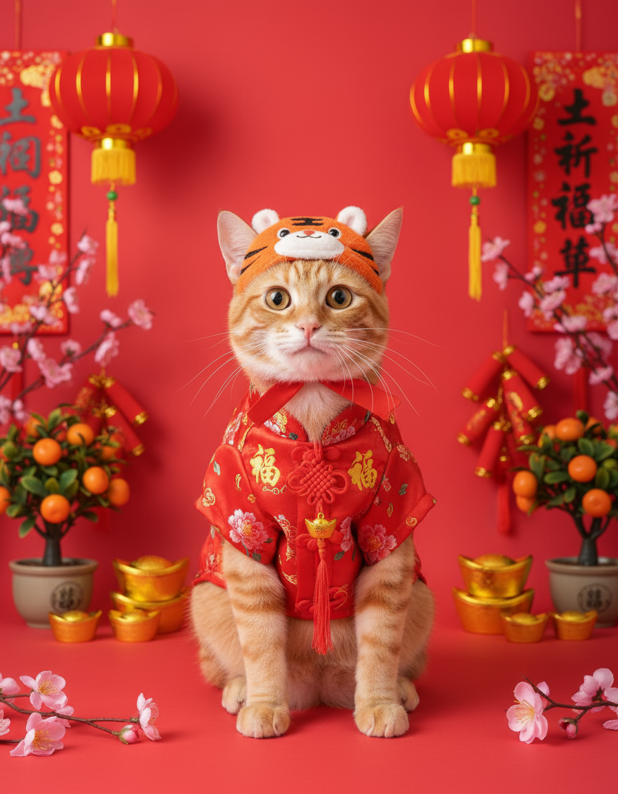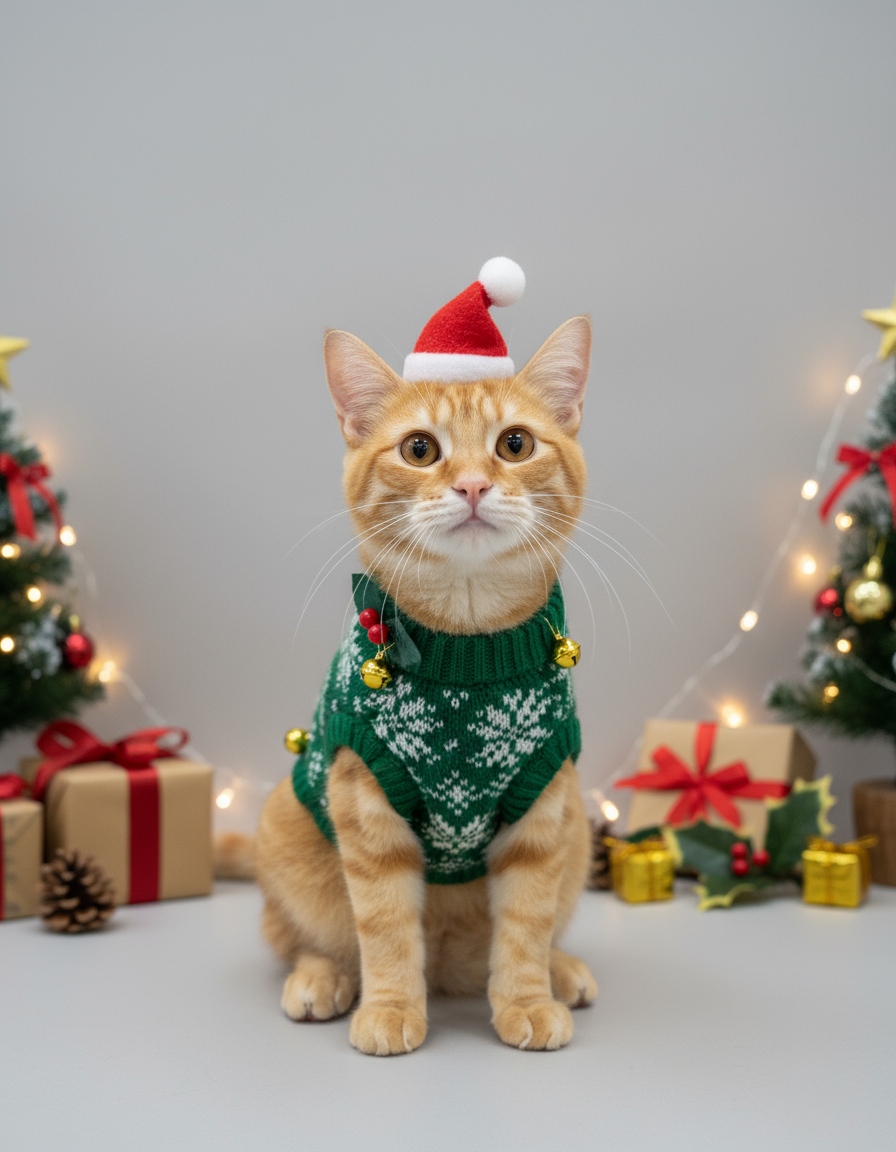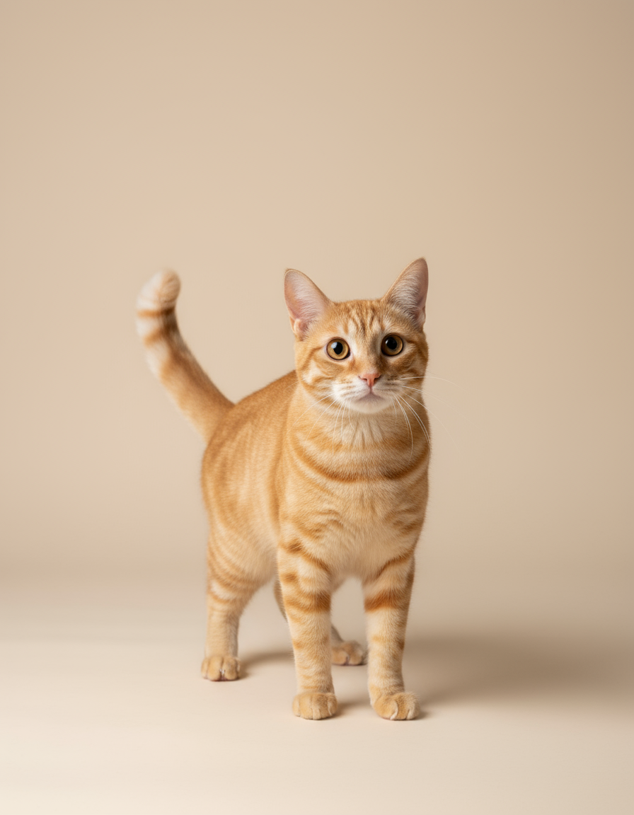 一張高品質的專業寵物沙龍照片,主角是照片中的(寵物種類)。牠以全身姿態呈現,平視鏡頭,表情活潑、可愛且生動,透露出溫順與開心的情緒。背景是簡潔、無縫的單色(淺灰色或米色為佳),營造出專業攝影棚的氛圍。光線採用柔和且均勻的工作室專業燈光,完美地勾勒出貓咪的輪廓,強調其毛髮的層次感和光澤,確保畫面沒有任何生硬的陰影。構圖清晰地呈現貓咪的全身,從平視角度拍攝。景深稍微深一些,讓背景保持一定的清晰度,同時仍將焦點集中在貓咪身上。照片質感應如同精修過般,擁有絕佳的清晰度、自然的色彩飽和度與適中的對比度,整體視覺效果專業而迷人。
