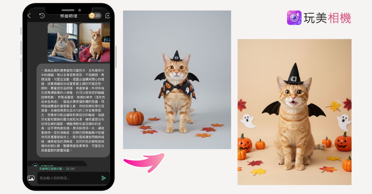 你可以使用玩美相機這款免費下載的手機 App,運用結合了 Nano Banana 圖像生成模型的修圖助理,再傳送照片和文字指令來生成專業的寵物沙龍照片。