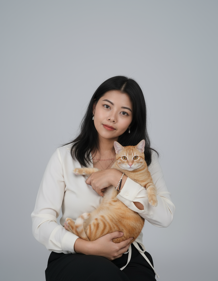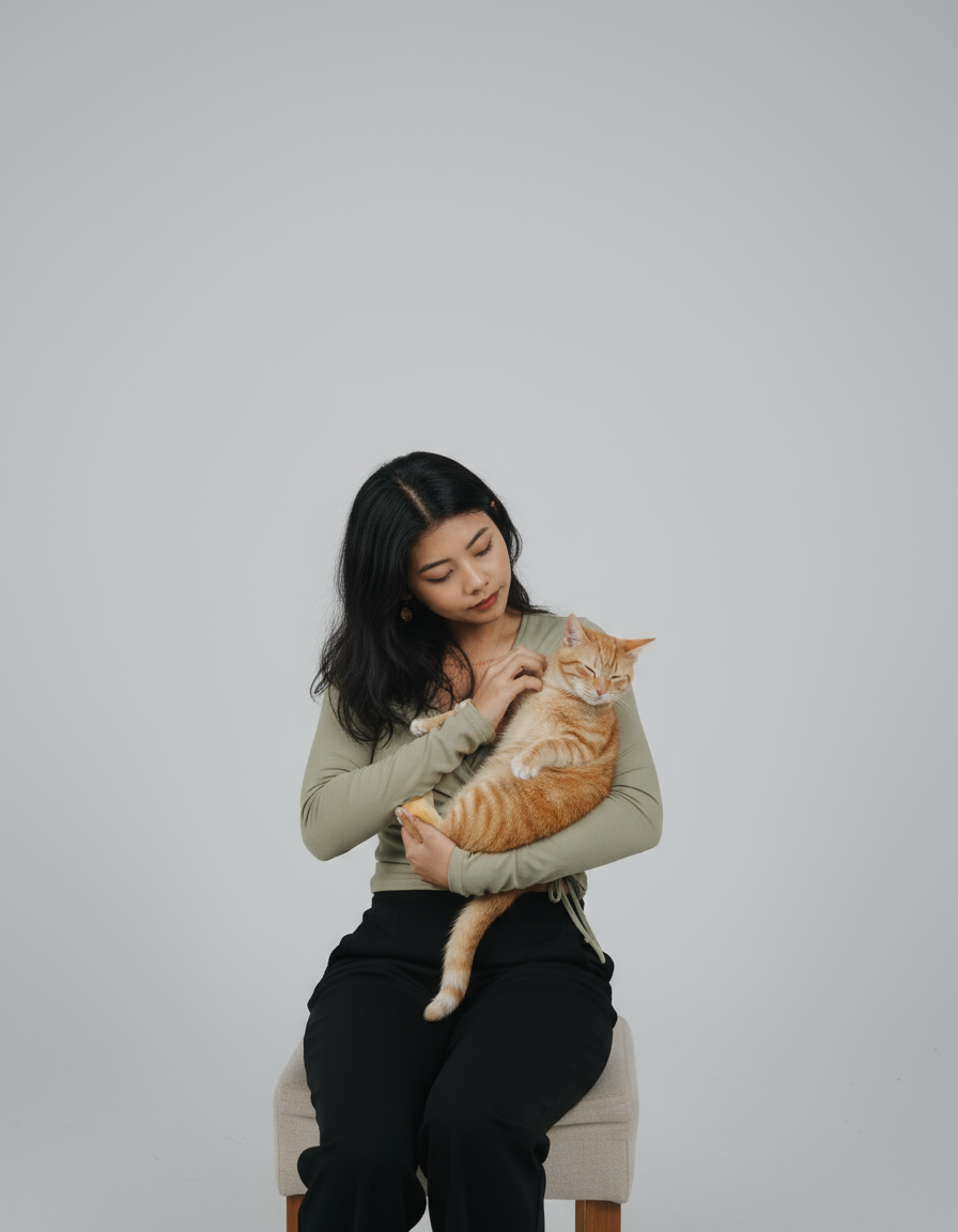 一張高品質的專業人物與寵物沙龍合照。包含照片中的女生和另一張照片的橘貓。一人一貓的姿態應自然且互動溫馨,主人抱著貓咪,貓咪舒適地依偎在主人身旁。背景為簡潔、無縫的單色(淺灰色或米色為佳),營造出專業攝影棚的氛圍。光線採用柔和且均勻的工作室專業燈光,畫面沒有任何生硬的陰影。構圖清晰地呈現人物和貓咪的全身或半身(根據最佳互動效果調整),從平視角度拍攝。景深稍微深一些,讓背景保持一定的清晰度,同時仍將焦點集中在人物和貓咪的和諧互動上。照片質感應如同精修過般,擁有絕佳的清晰度、自然的色彩飽和度與適中的對比度,整體視覺效果專業、溫馨且充滿愛意。