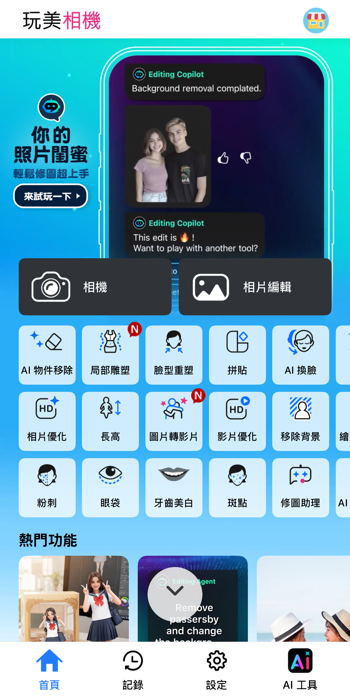 接下來點選修圖助理,玩美相機的修圖助理使用了最新的 Gemini Nano Banana 圖像生成模型,只要上傳一張以上的照片並輸入文字敘述,修圖助理就能夠幫你完成你的修圖或者生成需求喔!