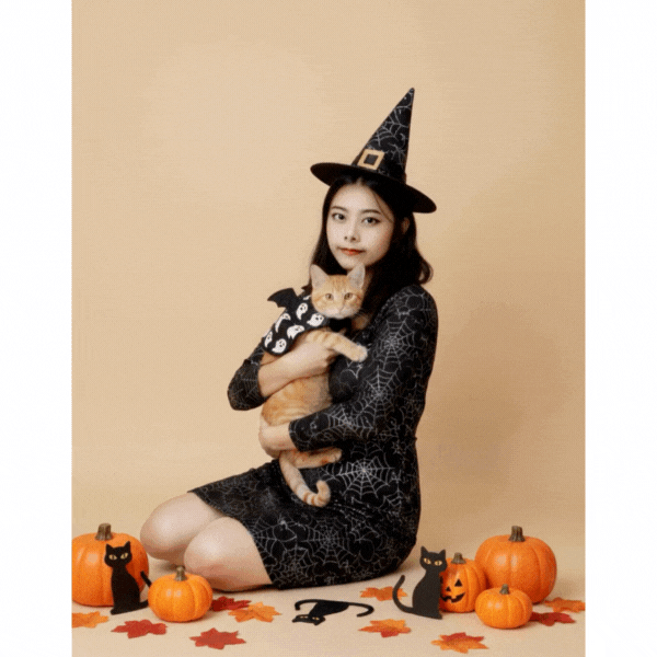 你也可以根據節慶,來幫自己的毛小孩生成各種可愛的節慶照,無論是萬聖節、聖誕節,還是過年,都可以應景的自由換裝,透過敘述來描述自己想要的場景,以下跟大家分享我的寵物萬聖節沙龍照指令: