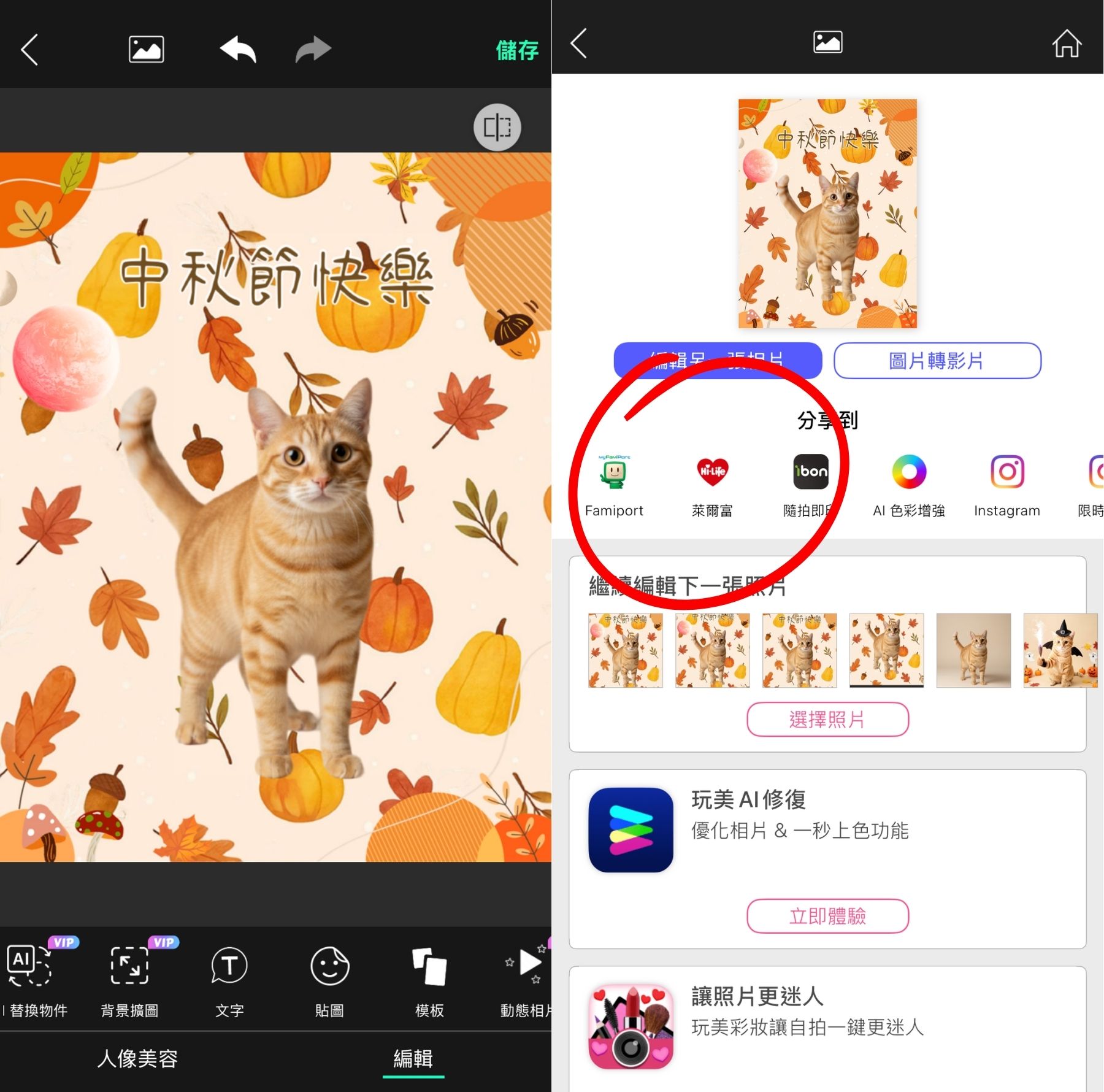 生成簡約的單色寵物攝影後,除了放到手機桌布,你也可以利用來做節慶小卡片!你可以從玩美相機中編輯後製,打開照片後,你可以利用移除背景來幫寵物沙龍照換背景,然後換上應景的秋季背景。