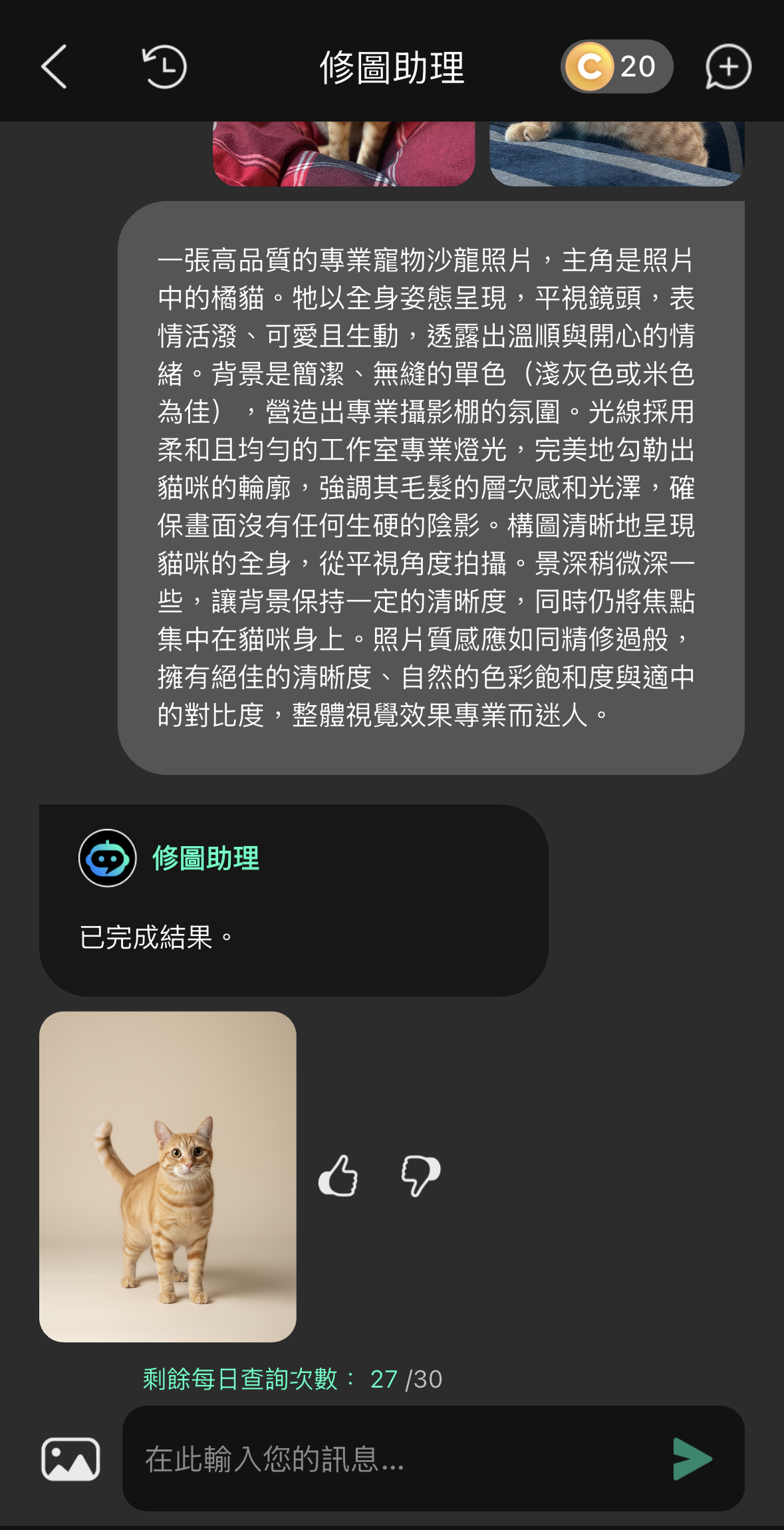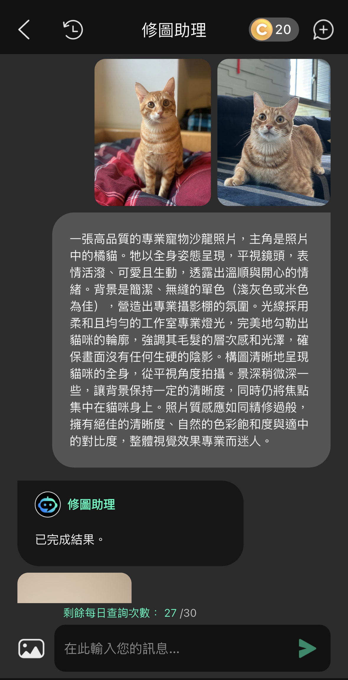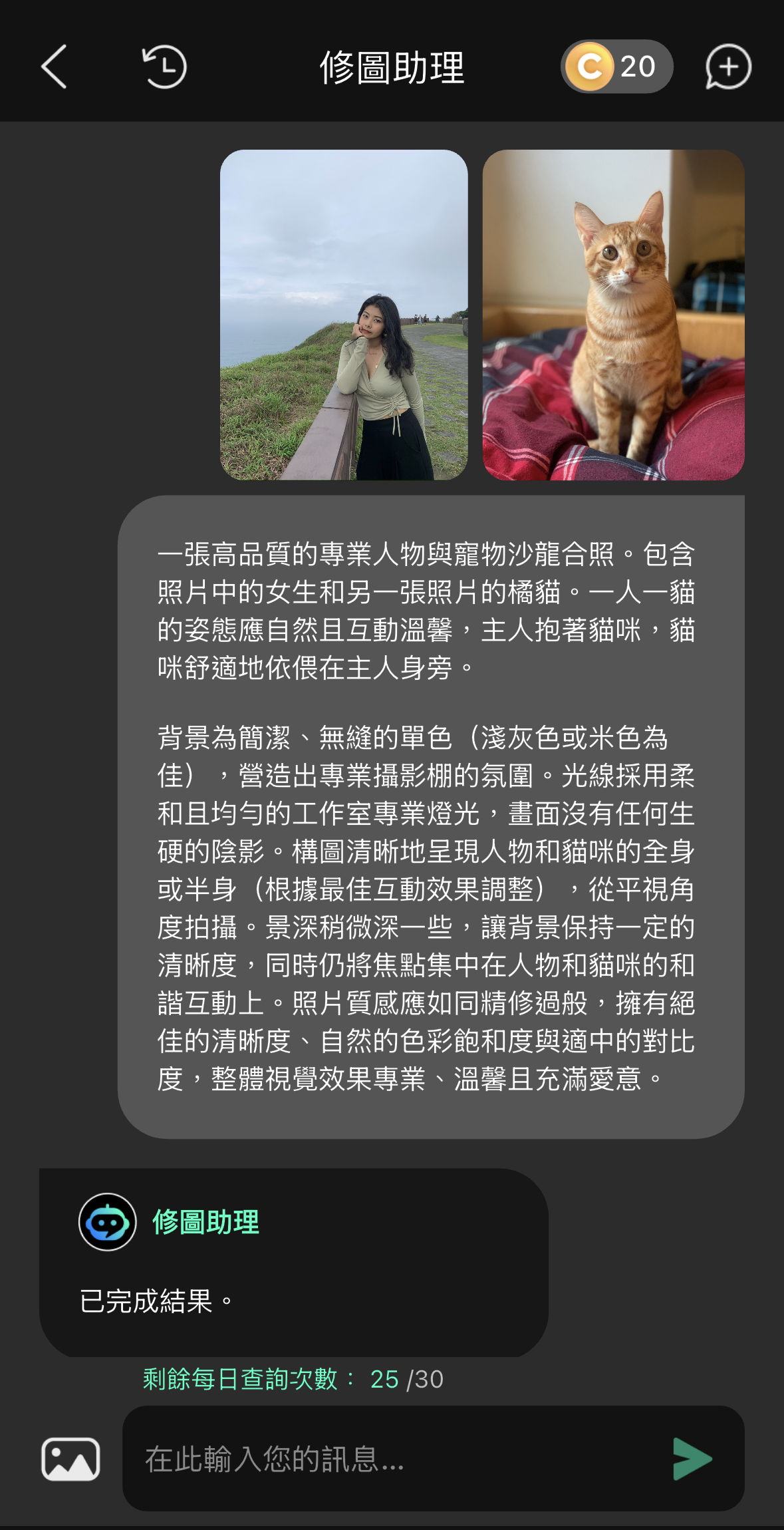 送出指令和圖片之後,稍等片刻,修圖助理馬上就成功幫我生成超可愛的寵物沙龍照囉! 推薦大家可以根據自己的需求微調指令,生成各種不同主題的沙龍照片!