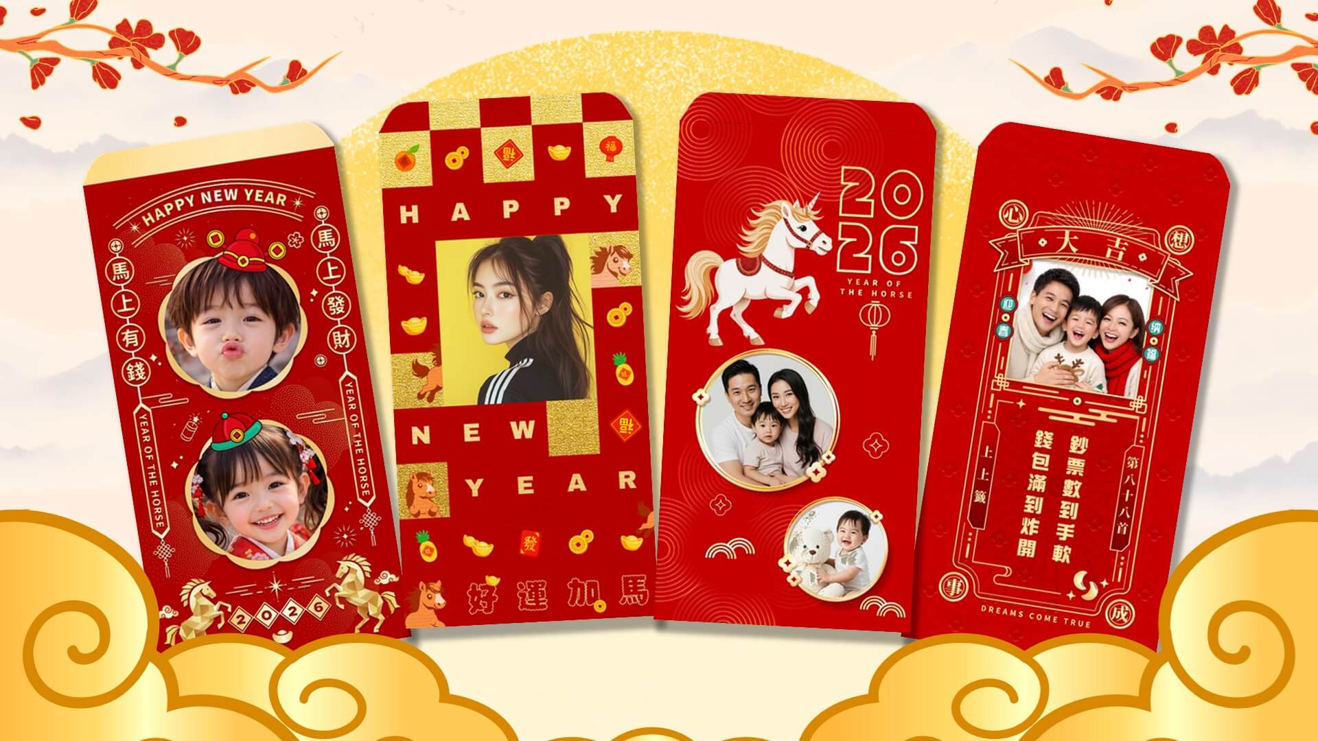 玩美相機每年皆會推出全新紅包袋模板, 2026 馬年紅包袋也搶先上架。使用者一鍵套用,並編輯加上照片或文字貼圖,製作自己的專屬紅包袋、春聯。