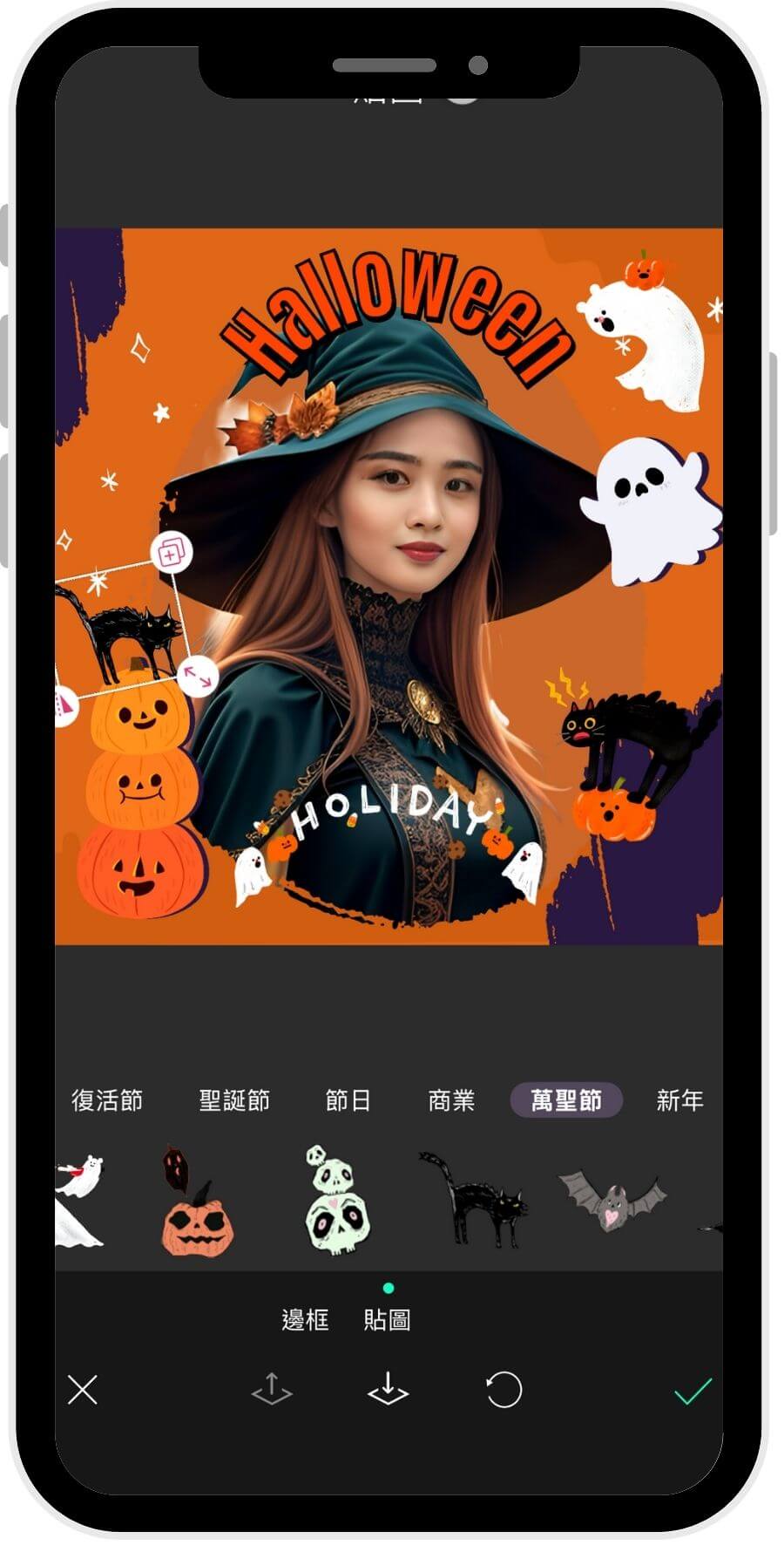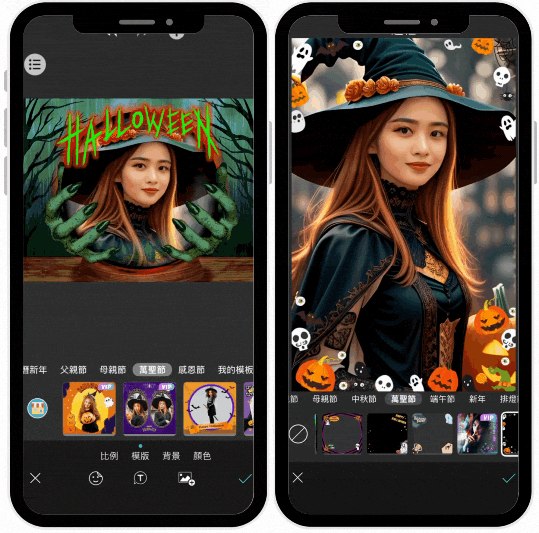 【玩美相機】中有許多功能模板都有萬聖節類別的素材可以運用,接下來跟大家分享幾個裝飾圖片的小撇步: