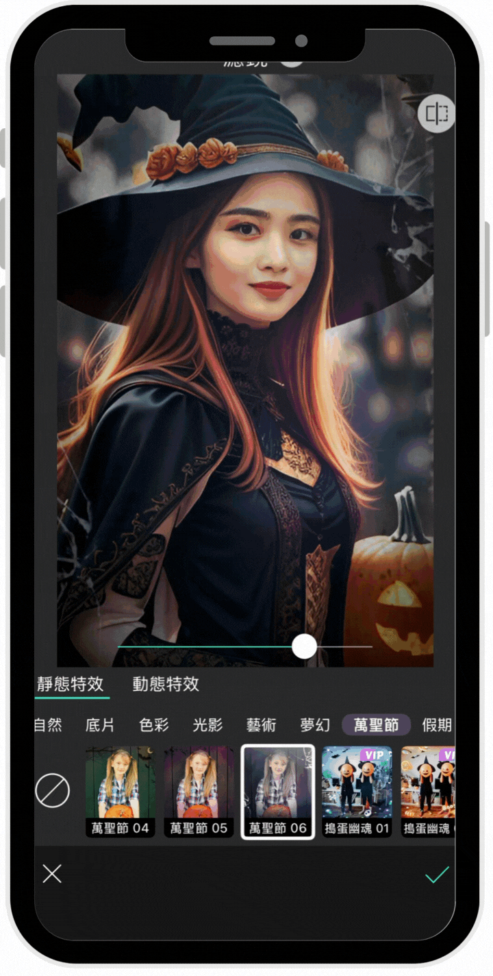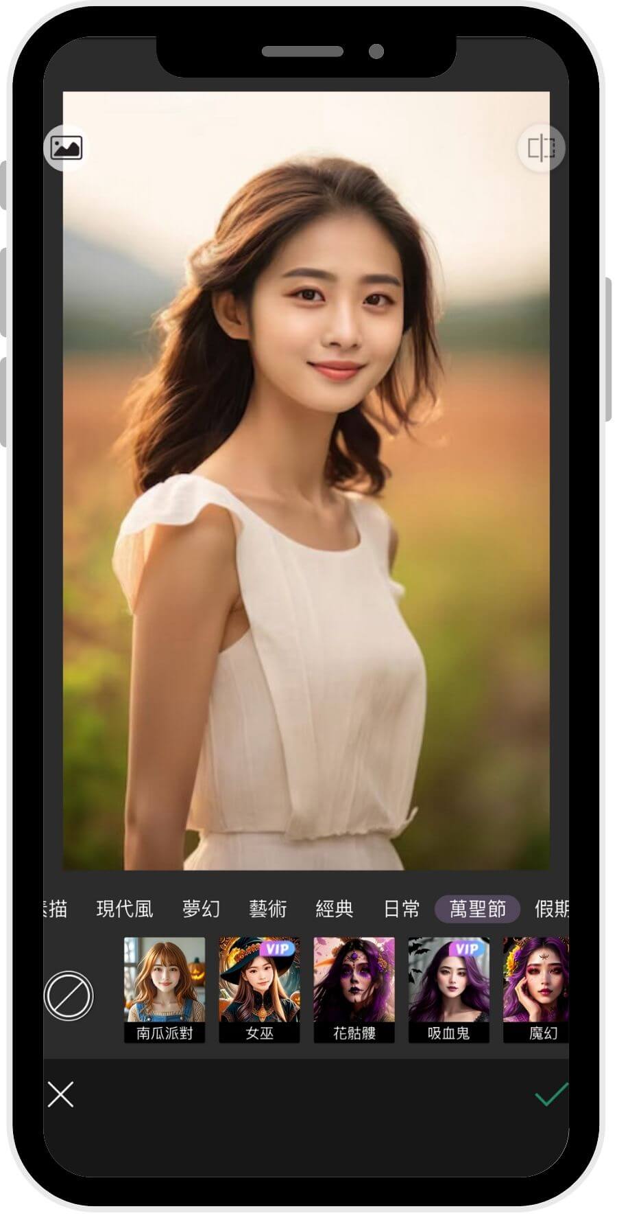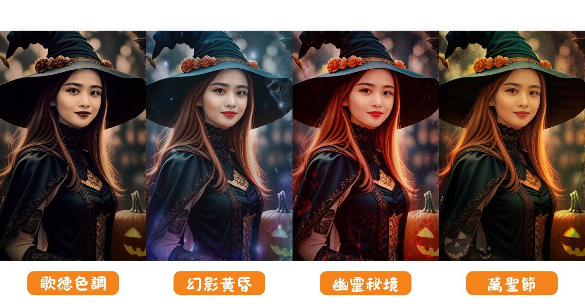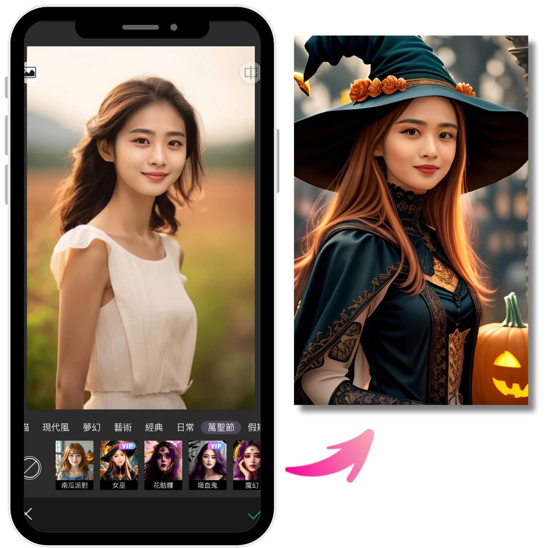 ▲ 選擇萬聖節類別的【女巫】濾鏡,等待 AI 生成,為你換上精緻的女巫裝扮!