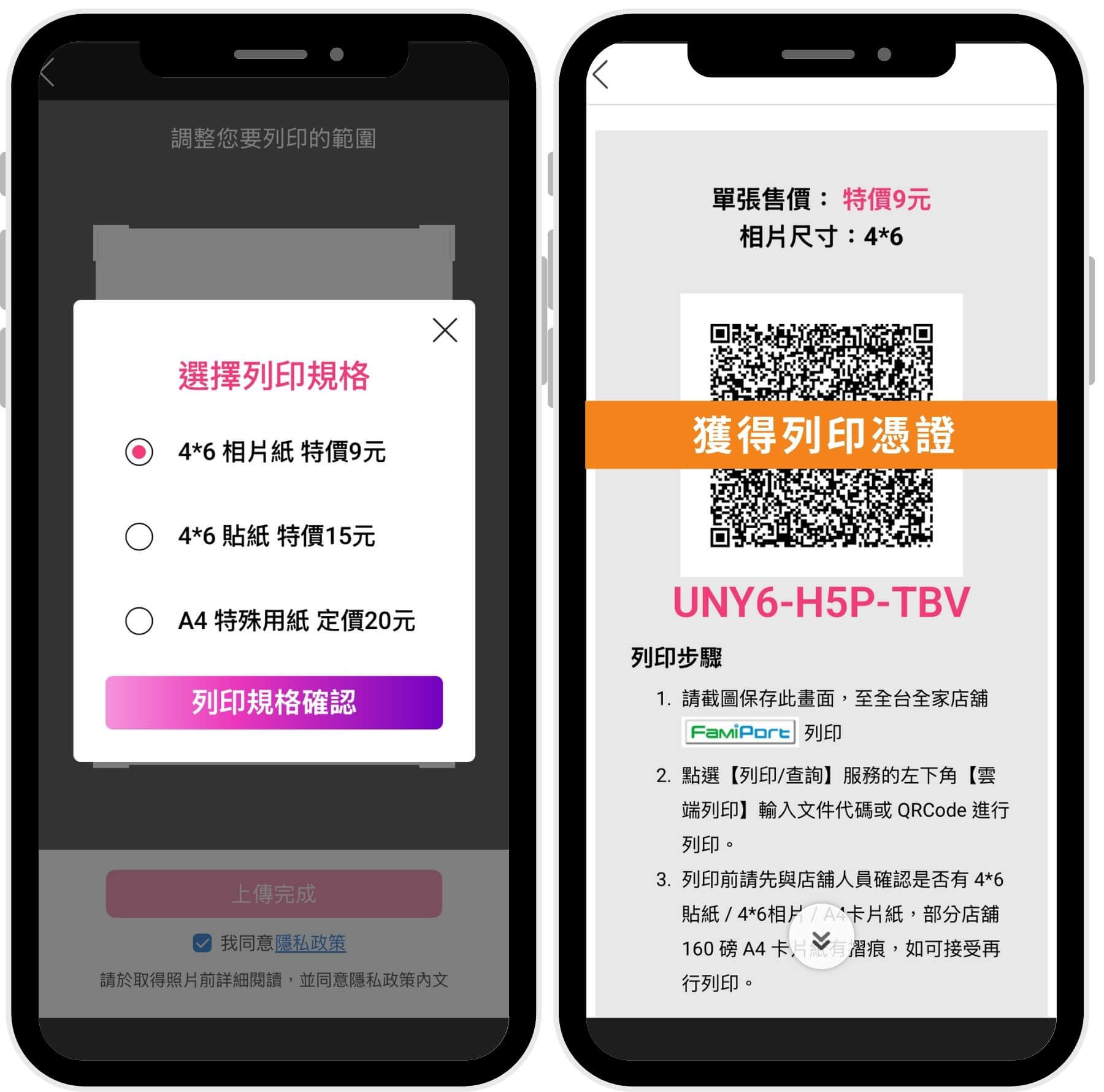 最後,選擇自己想要列印的規格,即可送出並獲得全家的列印憑證,只要帶著憑證前往全家 Famiport 操作即可快速將照片印出來囉!