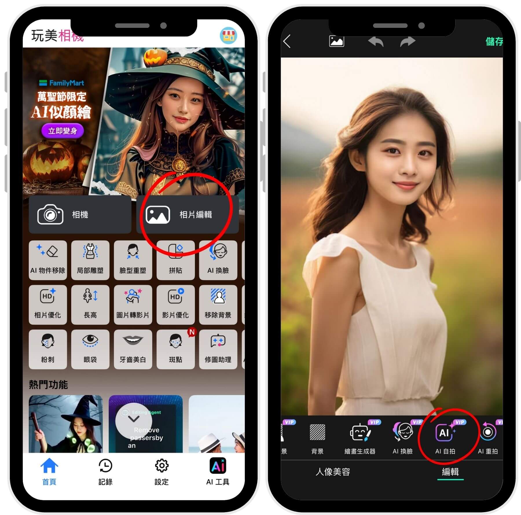 下載好【玩美相機】並開啟後,點選【相片編輯】並選擇一張自己想要使用的人像照片,選好後你可以在功能列表中找到【AI 自拍】功能。