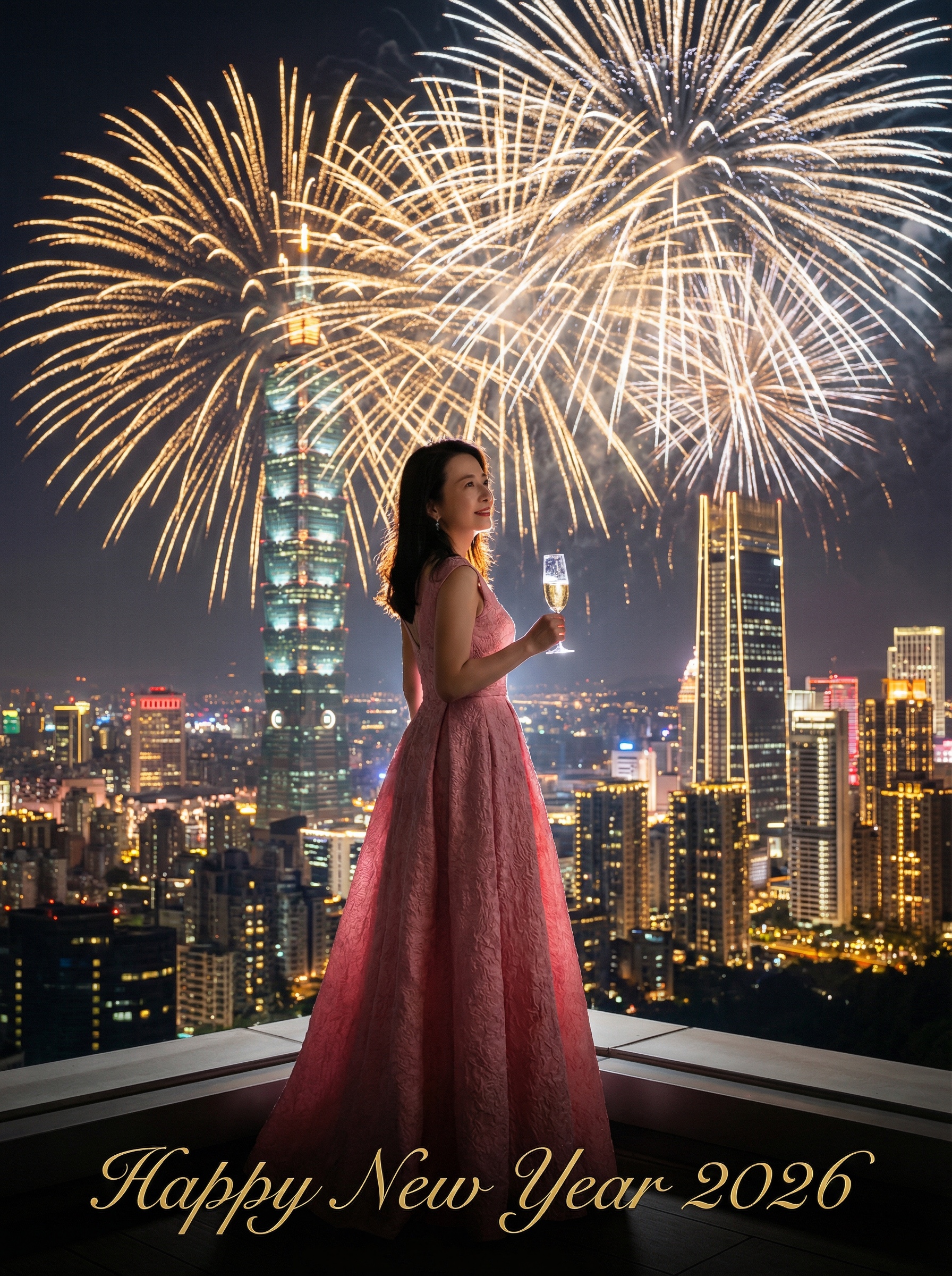 一位優雅的女性,身穿有質感的粉色晚禮服,站在豪華的高樓露臺邊緣,手持香檳杯。背景是台北 101 城市天際線,巨大的金色與白金煙火在她身後盛大綻放。煙火的光芒在她身上和髮絲上形成漂亮的邊緣光。攝影風格為電影感、淺景深,強調奢華的材質與光影。畫面下方有精緻的金色文字「Happy New Year 2026」。