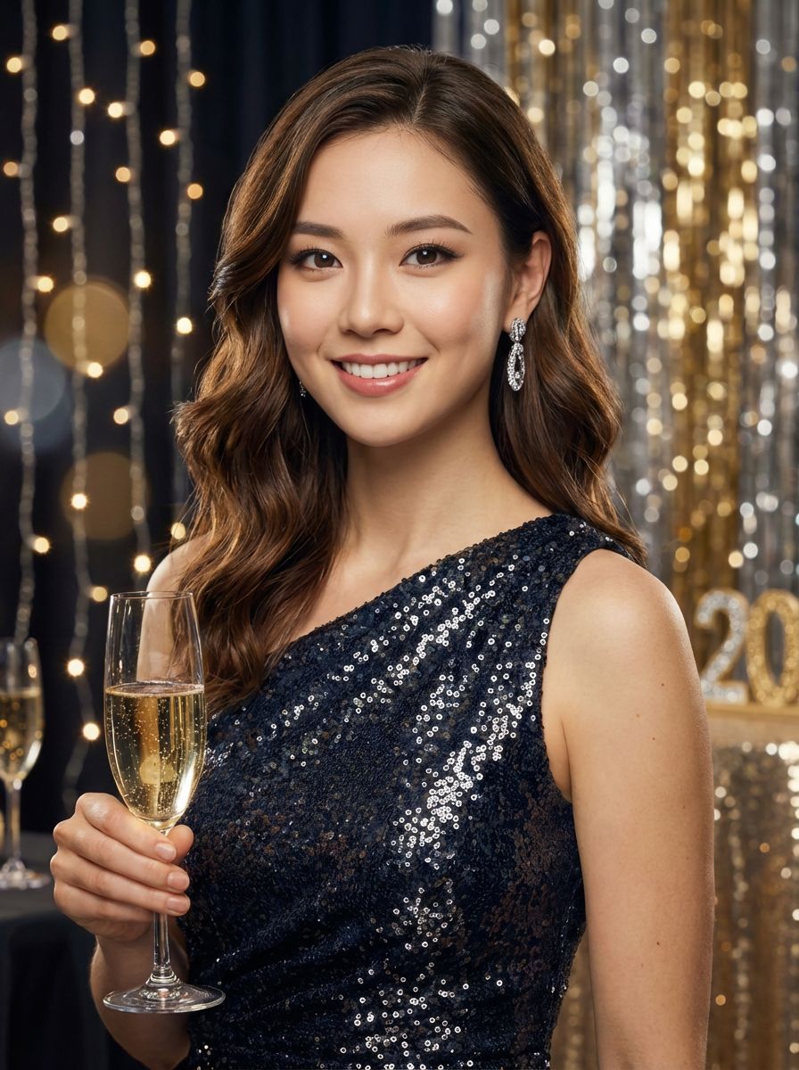 2. 「優雅的 2026 新年人像,迷人的派對服裝,閃爍的燈光,奢華氛圍,攝影棚燈光,高細節」