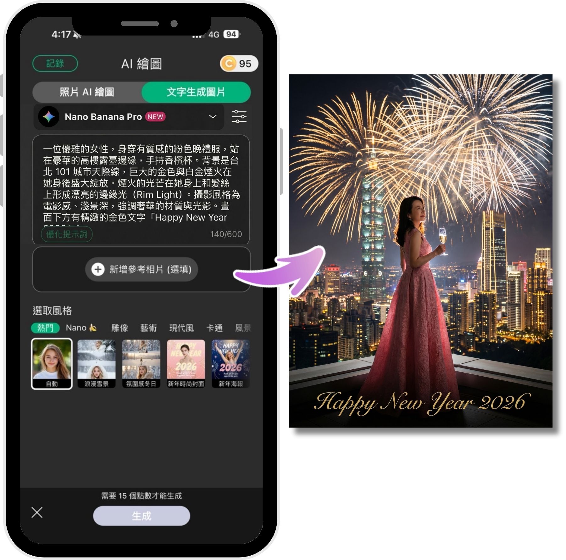 隨著 2026 年的腳步越來越近,是時候發揮創意了!無論是個人寫真、充滿節日氣氛的賀卡,還是社群貼文,AI 都能讓你輕鬆製作出令人驚豔的新年照片。
