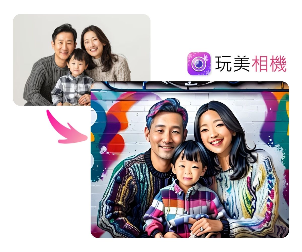 除了上傳自拍外,你也可以上傳全家福照片,選擇塗鴉藝術風格,直接變身潮流感十足的合照,保留原構圖的溫馨感之外,更增添了一番街頭藝術態度!