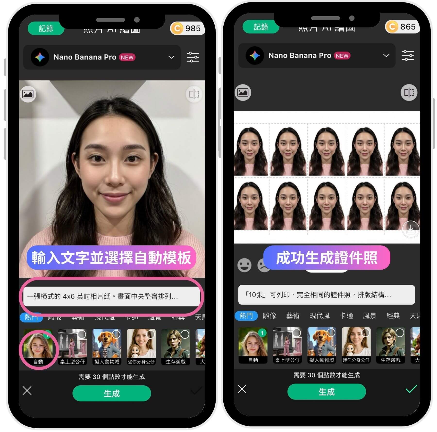 這是一個進階的隱藏技巧!如果你想要更客製化的證件照,甚至直接生成「4x6 排版」方便列印,可以使用「照片 AI 繪圖」功能。
