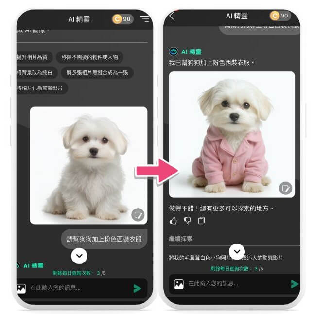 輸入任何你腦海中浮現的創意點子,像是把照片中的另外一半換成小熊維尼,或是把毛孩變成一頭獅子,甚至可以幫照片的人換衣服!