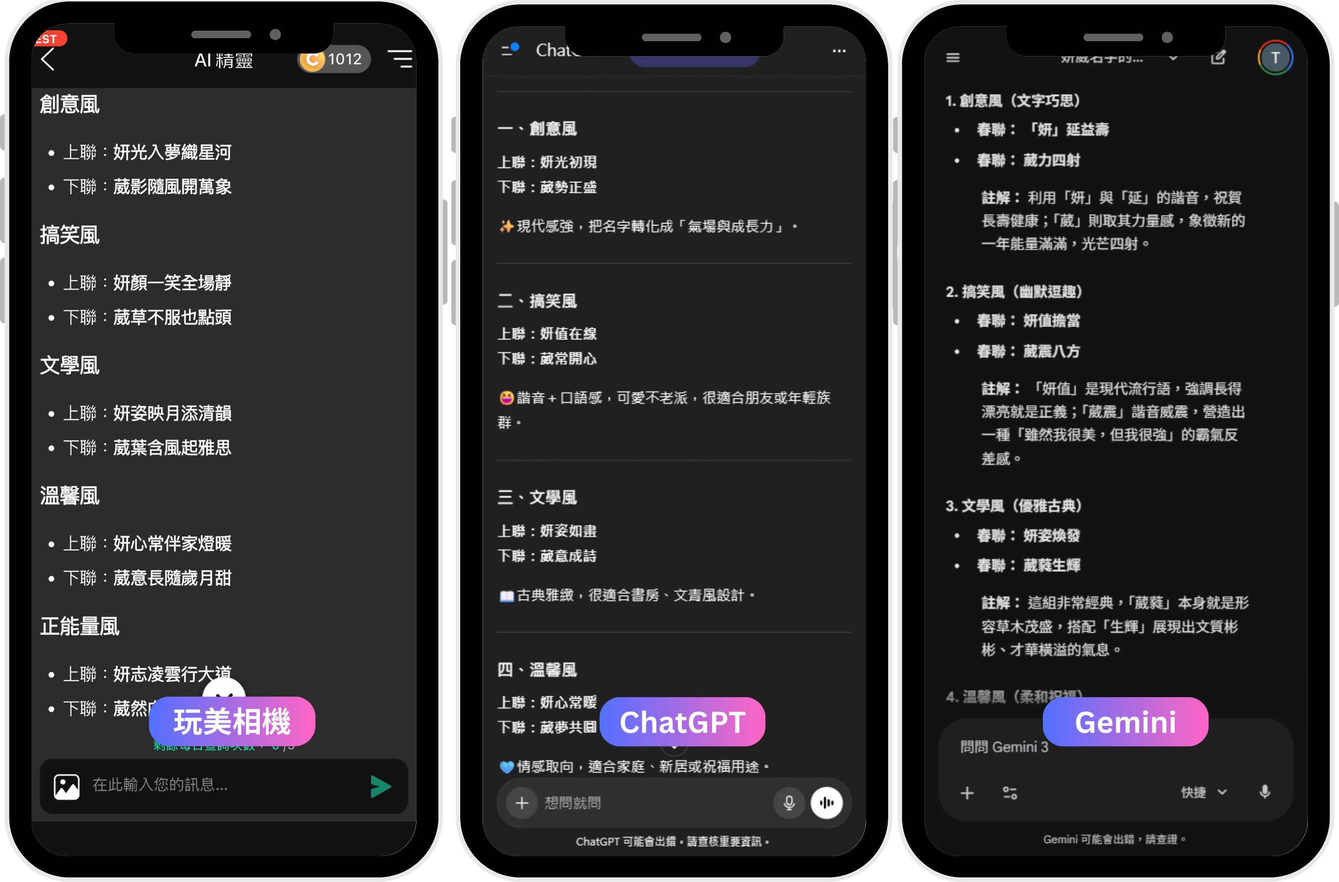接下來分別用【玩美相機】的 AI 精靈、ChatGPT 和 Gemini 來做姓名對聯和春聯產生的測試,為了公平起見,針對可以手動調整型的 AI 我使用的都是各自最新的免費模型,看看哪一種生成得比較好。