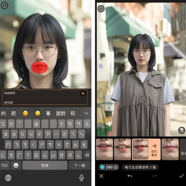 相片大師的「AI 局部重繪」功能可以為你生成各種笑容。