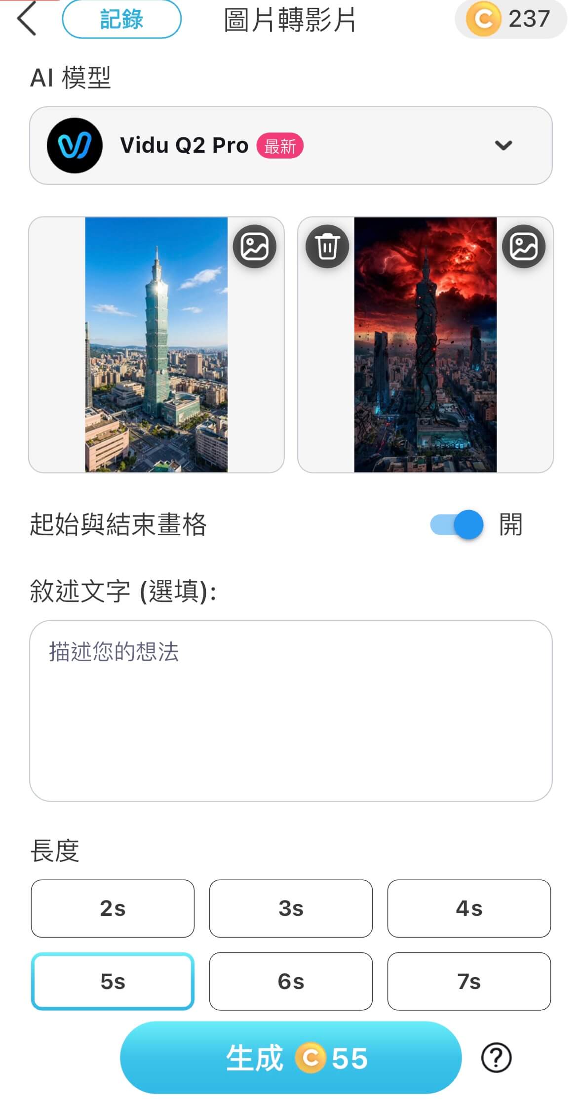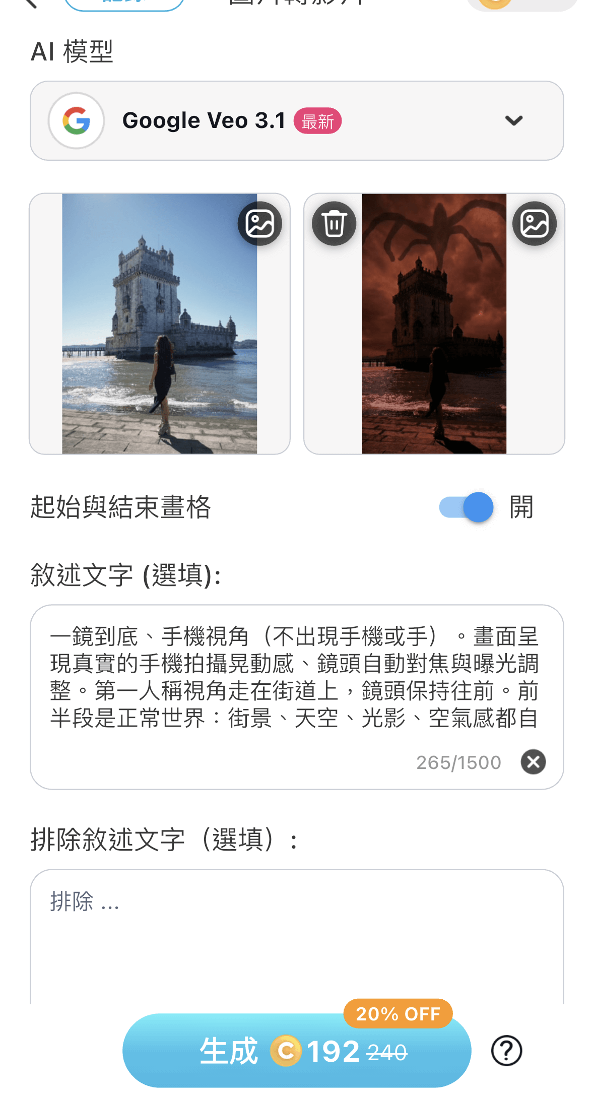其中 Veo 3.1、Seedance、Vidu、PixVerse 系列均支援「至少兩張參考照片」作為輸入,因此非常適合用來製作更精準、更高擬真度的怪奇物語轉場特效。 只要挑選你偏好的模型,再輸入簡短的中文指令,即可一鍵生成怪奇物語特效轉場影片。