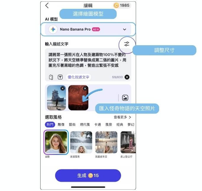 步驟三:接著匯入兩張照片、選擇 AI 生成模型 + 輸入指令