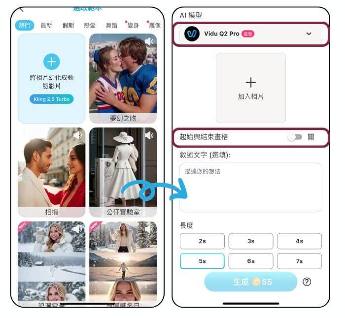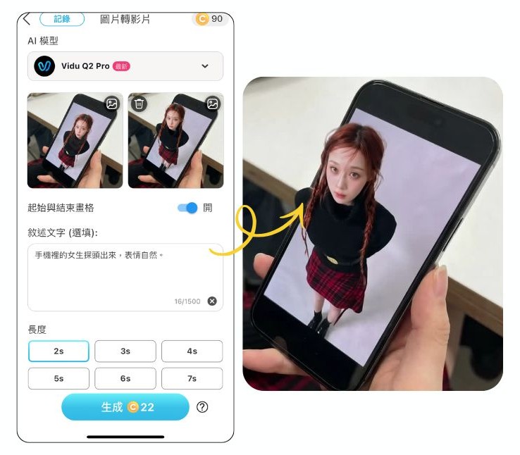 | ▲ 讓圖片動起來指令:手機裡的女生探頭出來,表情自然。(推薦使用 Vidu Q2 Pro 模型生成效果最好) |