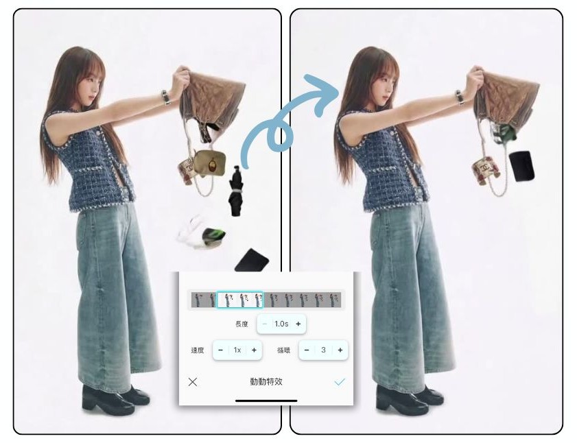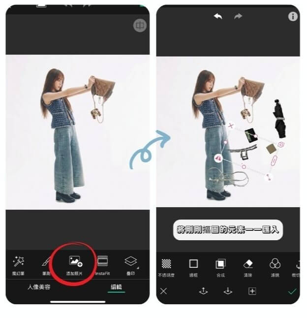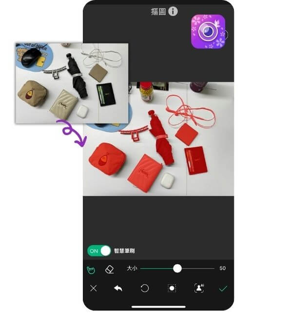 步驟一:將包包內的物品,開啟玩美相機進行摳圖