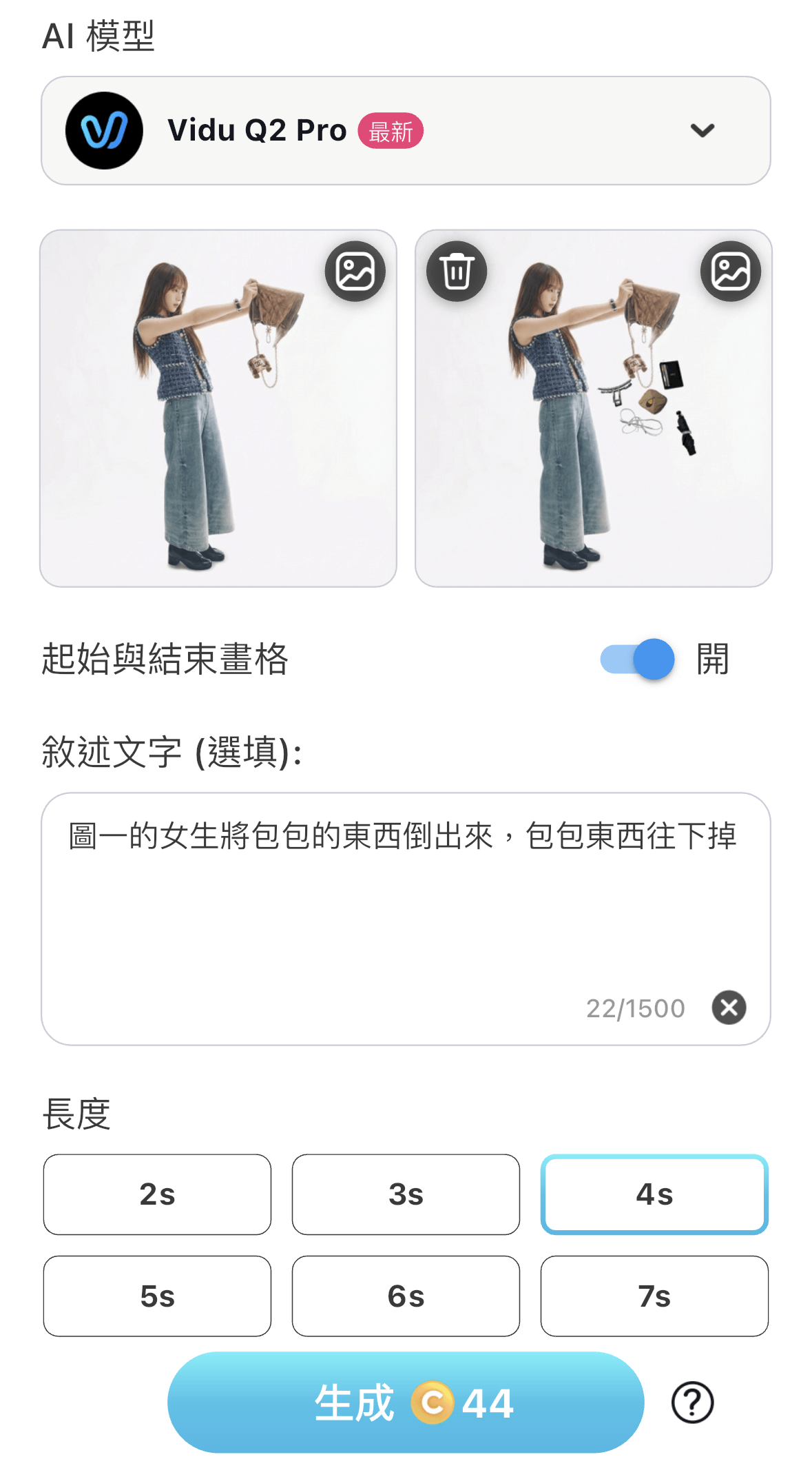 ▲ 輸入指令:圖一的女生將包包的東西倒出來,包包內的東西往下掉