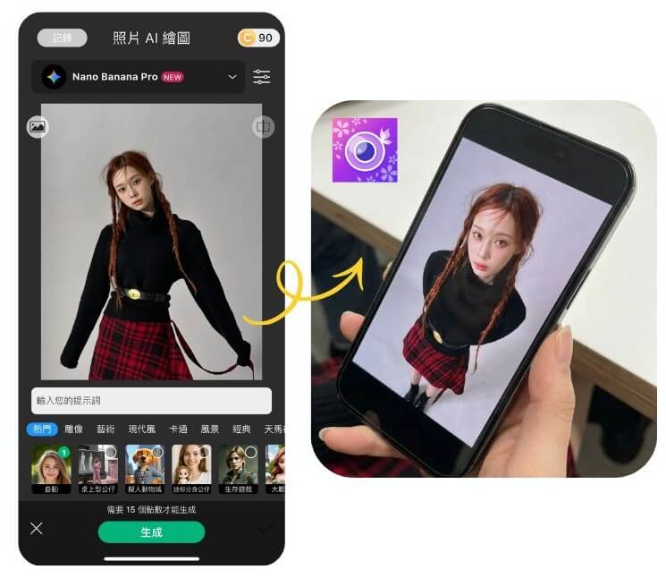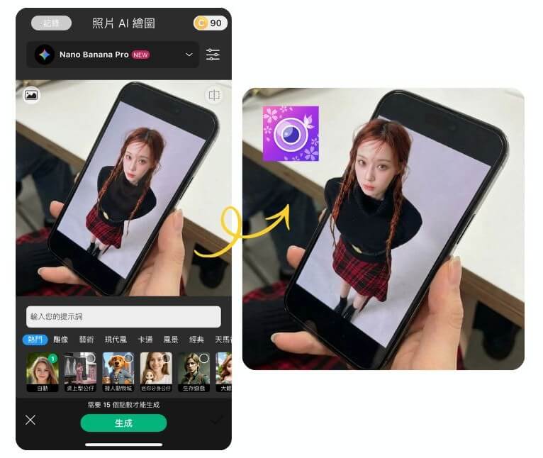| ▲ 輸入指令: 生成一張超寫實的俯視角照片。畫面中手拿著手機,但請讓「手機佔整張圖片 70% 以上」,非常靠近鏡頭,呈現大特寫效果,而不是遠遠地拍。 手機必須位於畫面中央並放大,邊框清晰、玻璃反光自然。 手機螢幕內是一位女孩,她完全在螢幕內,不可超出螢幕邊界。女孩比例放大、靠近螢幕,抬頭看向鏡頭。 螢幕內的背景必須是柔和的灰色棚拍背景(與參考照一致),不得使用白色背景或其他顏色。 畫面構圖重點:手機要非常大、非常近、佔畫面 70–80% 、手機與手為主要主體 、背景只有少量模糊的室內環境、 禁止手機太小、禁止遠距離拍攝效果。 |